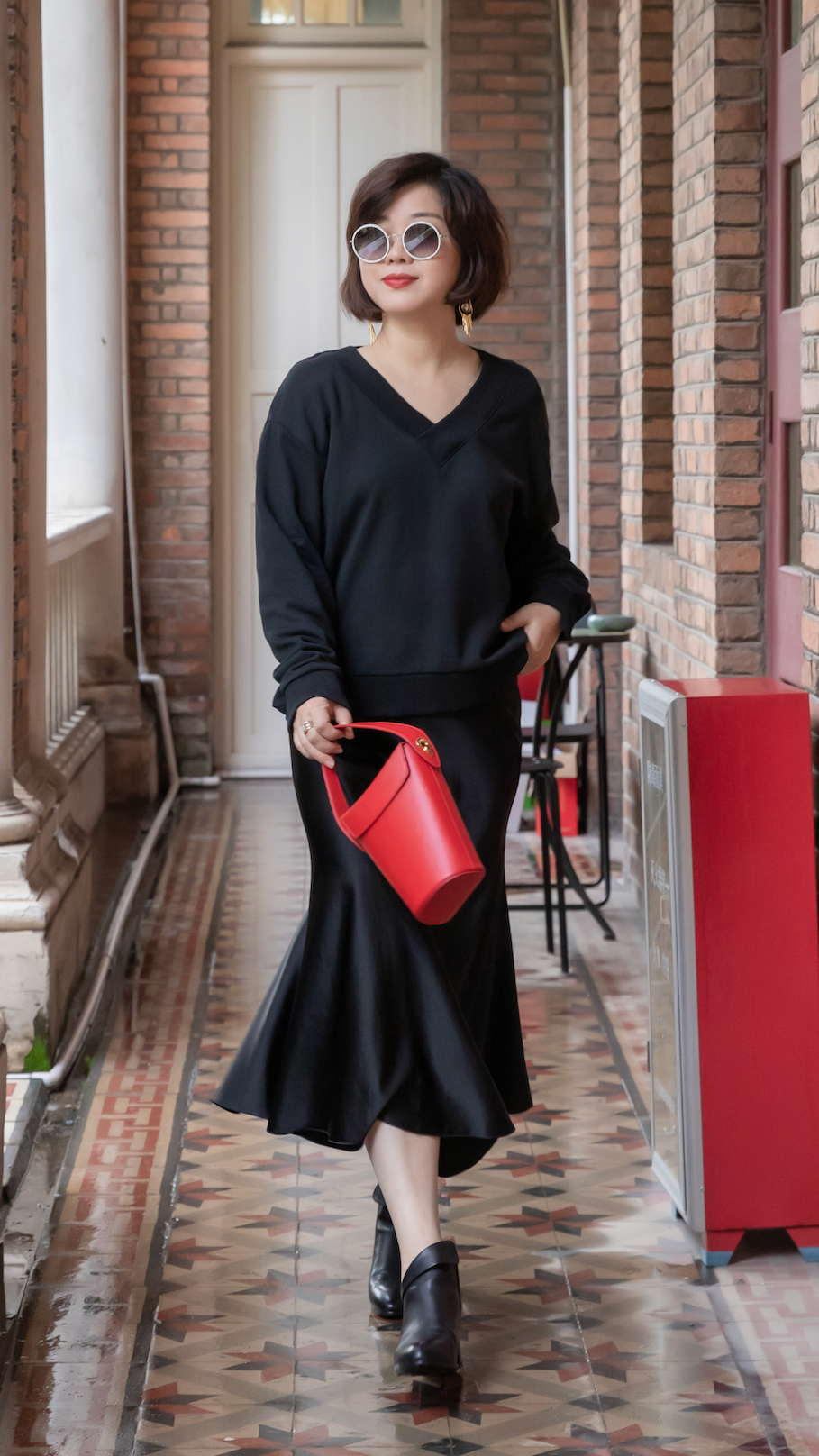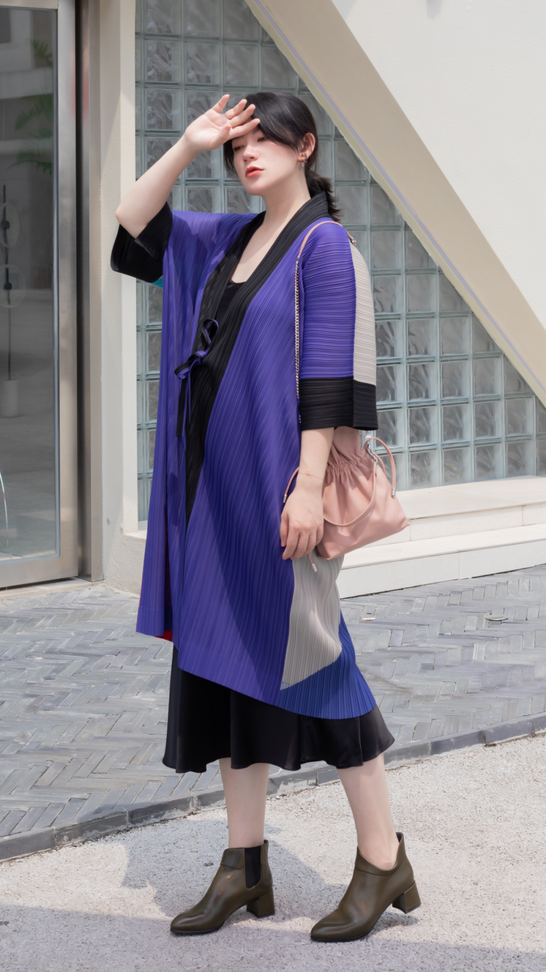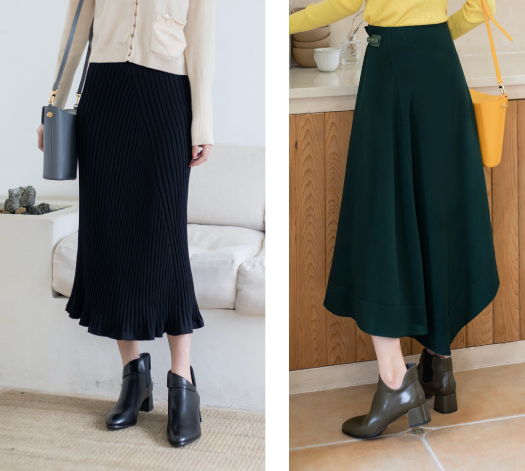 但是也得说在前面,因为设计的独特性,脚掌特别宽的姑娘们要看好尺寸表,或者咨询客服小姐姐,谨慎选择!好的,现在进入这次主角的介绍,这是一双不用担心撞鞋,又竟然好穿好搭配的实力切尔西靴。这个鞋所谓的设计灵感,其实跟我们其他的商品一样,就是我自己想要这么一双鞋,然而市面上买不到,只好自己做了一双。其实除了传统意义上这种靴子的圆头、无鞋带、到脚踝的长度之外,我还希望它有点不同:☉比如有点不对称(常常穿得很简单,就希望鞋子有点设计感);☉靴口更立体一点(毕竟腿粗,细窄的靴口更显得我像个足球运动员);☉鞋子的形状不要笨重(毕竟除了帅气还想要靴子也能搭配优雅一点的着装)。然后有一天我在做衬衣打版改领口时突然想到(好的不要慌张,明年春天就有衬衣了),要不也给我们靴子做个翻领?然后我就冲到鞋厂去跟版师沟通了。版师也体谅我这个丝毫不专业的“设计人员”,没有图纸嘛,我们就现场拿一对鞋来剪好了(心疼那双被剪的无辜的鞋)。确定了像“翻领”一样的折边,靴口果然立体蓬松了不少,但是问题来了,如果折边是固定的,那么就会很不灵动,跟没折的效果一样,但是如果不固定,两边都开口做一样的宽皮筋,“领子”一走路就飞起来,也不好看。我们拿着剪刀想了半天,突然想到要不然我们放弃靴子一侧的皮筋,做一个有弧度的口,让折边也能从窄到宽一路顺延,一直到内侧皮筋的地方停下,跟真正的衣服的轮廓一样,正好也能体现我们想要的不对称。鞋厂的版师一边看我像折纸一样剪来剪去,一边提出了在真正做鞋时候的很多结构上的困扰,但最后他还是很好心地表示,我帮你试一下吧,不见得能做好呢,但是我们尽量······说起来这已经是去年的事情了,就因为这个奇怪的结构,我们跟鞋厂试了一次又一次,有很长一段时间,我都觉得,这个鞋子大约是做不出来了,但是很神奇,在今年8月份,这双鞋完成了。成品的样子不多说,大家看图就行,基本上是达到我心中的设计效果了。衬衣领靴口线条流畅,而且因为皮料有一定的厚度,看起来很有层次感。有了折边后,因为视觉上厚度略有增加,更是衬得脚踝纤细。脚踝处流畅的一边高一边低的弧度,比通常切尔西靴齐刷刷的靴口设计露出的腿部线条更多,更显腿长,而且在正面看有一个斜切的弧度,也能有修饰脚踝的效果。▲这组正侧面照就非常清晰地诠释出了我们这个斜切弧度的优秀,看上去是不是很纤细?鞋头我们也用了更秀气精巧的小圆头,搭配上好走的4.5cm方跟,调整比例就在穿上鞋的一瞬间!不过说到这个特别的设计我还是有一些注意事项要跟大家说明:因为人体的骨骼大小和关节位置不一样,这个靴筒弧形我们已经是尽可能调整到最大包容范围了,连O形腿姑娘们可能有的轻微踝骨外翻的情况也考虑进去了。