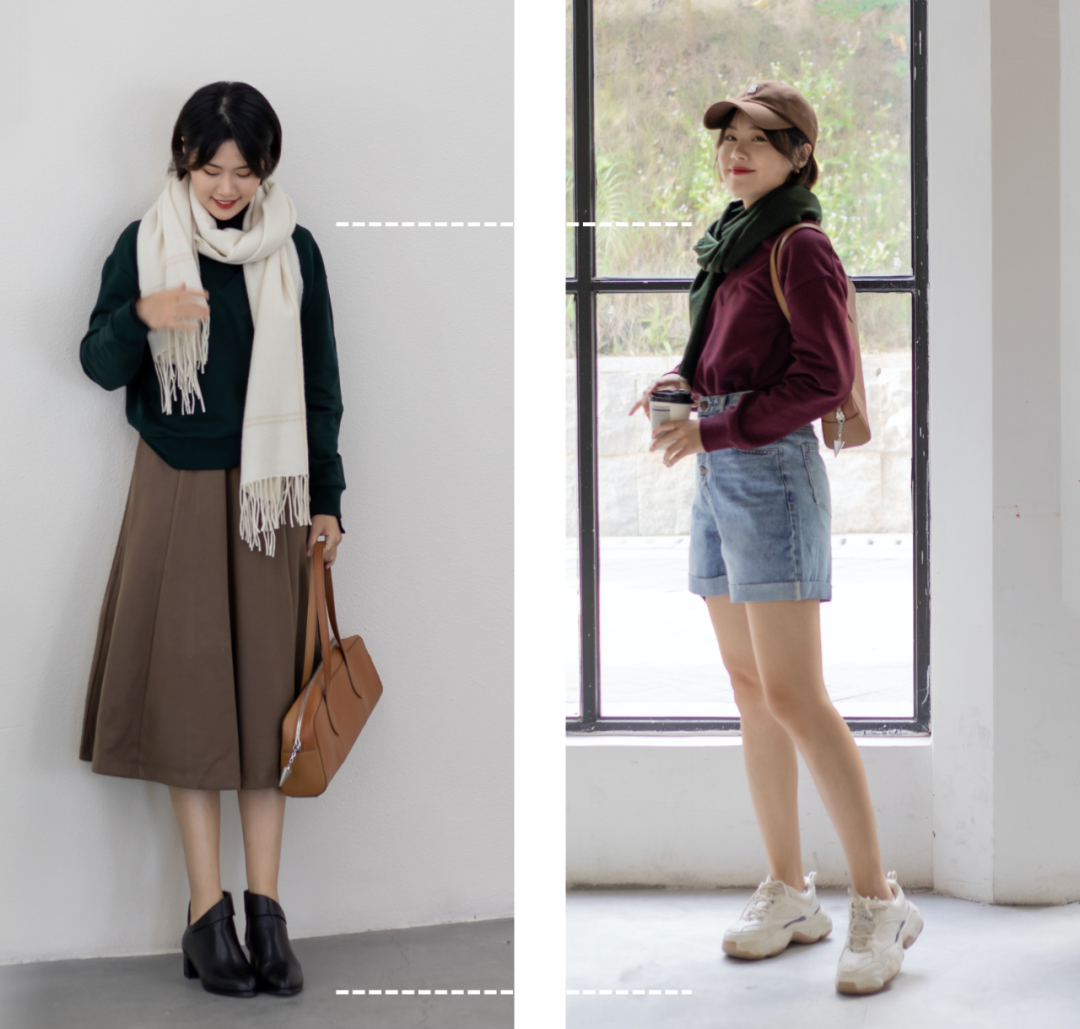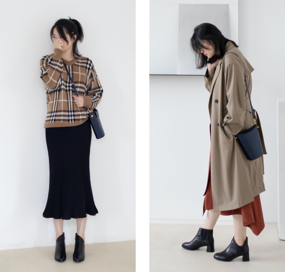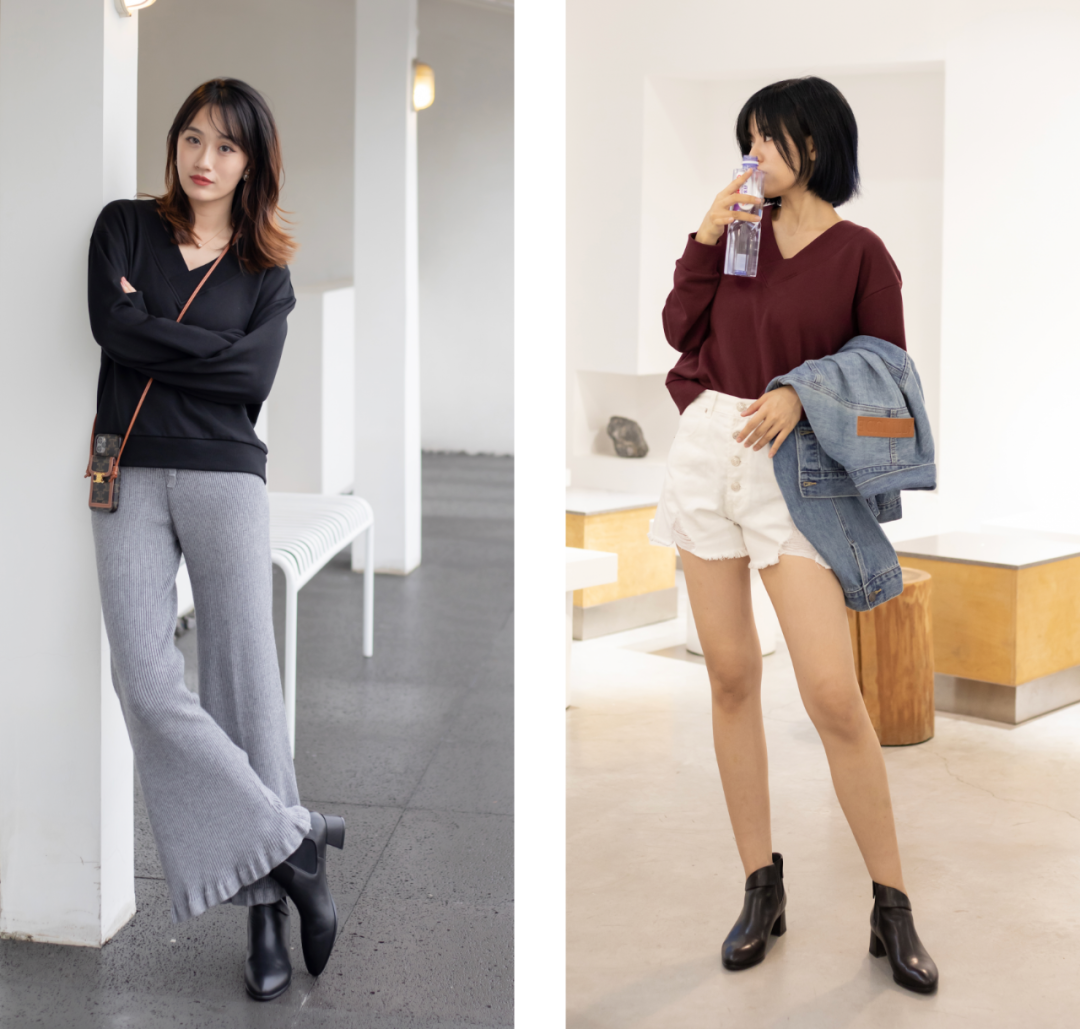 虽然鞋里外面看不到,但是也用了全皮,靴子嘛,比单鞋更要强调透气感,当然我们一定要用皮的。考虑到有些姑娘光脚穿着,真皮鞋里也会让脚的触感更好,长时间穿着更舒适,习惯穿袜子穿着的姑娘,也能感受到透气性。鞋垫也是用的最舒服的高弹力记忆乳胶鞋垫,一踩下去就会有小小的弹性和完美的柔软感。而且我们的橡胶都经过了防滑处理的哦,遇上雨天也不怕,穿着它狂走也没有出现打滑,算是能够应付多种情况。鞋型是细长的,很收脚,而且鞋面可以把脚背包裹得很好,走起来完全不费劲。鞋头部分做了小圆头,上脚显得脚愈发秀气,但又比常规的圆头要时髦。可能图片看不出来,但是大家上脚就知道了,这种鞋头能够最大限度地修饰脚的宽度,属于鞋中显瘦款。▲左边是黄小姐的小胖脚,右边是四姑娘的瘦脚,穿上靴子看起来差不多一样匀称,这强大的修脚效果也是没想到吧。也是调整了好多次,大家懂的,鞋口这个事情非常难,太紧了会把显得小腿粗,太松吧会显得腿很短;更何况这双切尔西靴的鞋口又被挖了一块下去,所有的包裹只能靠弹力布控制和鞋面的优秀包裹性。不过我们解决了它,这个没有什么技巧就是不停地改不停地试,大家看图吧,就是拥有这么显瘦的宽松度。▲我们拿美女读者苑子的两张照片对比一下,穿老爹鞋跟穿这双切尔西靴比,小腿线条几乎没差。太方正的跟又有点笨,异型跟呢一是怕不好走,二是不耐看,所以我们最后还是选了梯形跟,既轻巧又好看好搭配。黄小姐这种选鞋优雅占第一位的人,都一点不嫌这个鞋跟粗。说是高跟靴,但其实也不太算,4.5cm。但不要小看哦,有时候加上这4.5cm,人的比例就好看了,身形也不一样了。话说虽然我现在只能穿平底拖鞋,但越是不能穿高跟鞋,就愈发爱高跟鞋,特别是这种不算高的高跟。而且很多姑娘们说这个鞋看起来不止4.5cm,看起来特别高。你们看,这不就看出我们的设计能力了嘛,明明是穿起来很舒服的高度,因为拼接和鞋楦弧度好,硬是有了超高跟的效果,真的穿上超级显高。