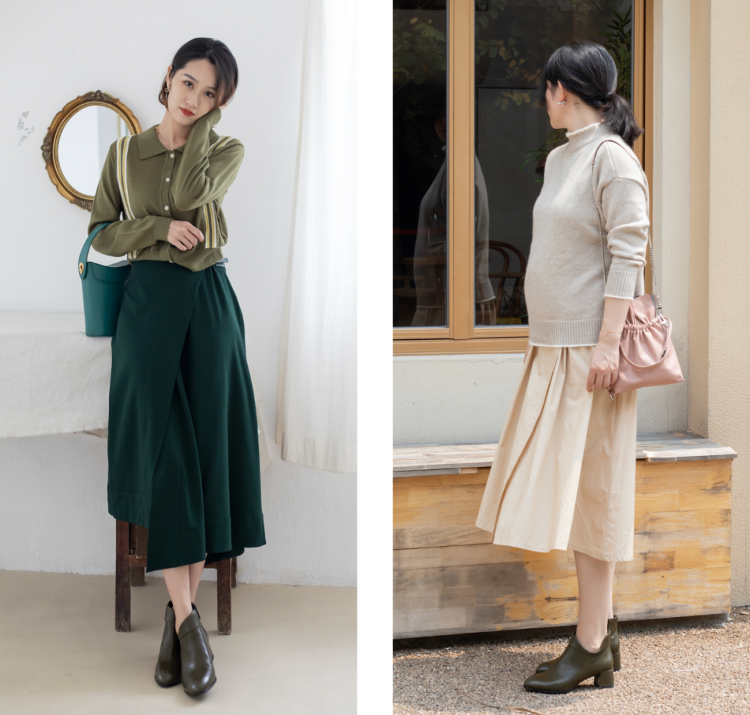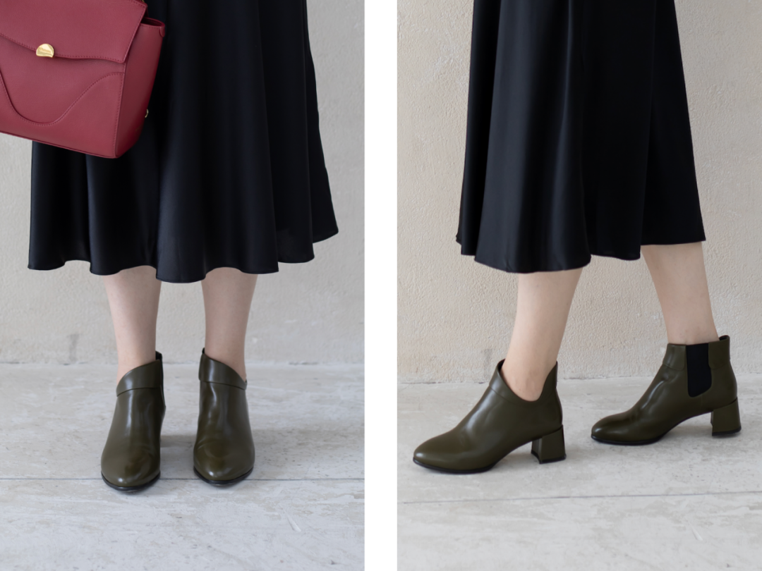 更重要的是,这4.5cm真的就是如履平地嘛,丝毫不影响我们工作中的女民工如风一般地行走。我一个快七个月的孕妇穿起来也觉得非常舒适。说实话我之前不咋想做短靴也是怕会显腿短,但后来我们这个靴子结合了我们上面说的几个设计,真的上脚来试,发现原来更短的切尔西靴也很修腿哦!搭配到小腿下的裙子也非常好看,显腿长又高级。冬天大衣穿得厚,就是要靠脚踝露出这一点点纤细来伪装瘦子!大家春天的时候也可以裙子穿起来,露出一点腿更好看。大多数人的穿衣风格都是日趋简单的,好看的鞋子包包和配件就会成为整体搭配的关键。为了搭配同样是做了两个颜色,一双黑色,一双橄榄绿色。特别是这双鞋子做成黑色,在日常着装中可以完成不过脑子的搭配,又容易穿出个性。跟顶个球性质一样,是个搭配神器。虽然这次我大着肚子没有办法拍,但是这个鞋子搭配黑色连裤袜一定是无敌显腿长的,买黑色的姑娘一定要试一下看看。橄榄绿,我又要来自夸我们品牌对于绿色的灵活运用了。这个橄榄绿比我们以往做过的所有的产品的绿色都要更接近大叶植物的绿,而且是秋冬树叶的绿,微微有一点黄在里面。骤然看过去不会存在感特别强,柔和的气质更突出一些,跟秋冬的衣服更相配。但是看久了这个绿色就会很有复古感了,特别是穿一段时间,表面有使用痕迹之后,它会带上一点军靴的潇洒,搭配上这个特别的造型,喜欢朋克风格的姑娘们,也会觉得它特别摇滚;还是那句话,实物颜色肯定好看过照片,这是我们品牌的一大特色啊哈哈哈,就不改进了。好了,说完鞋子,来说说价格,这次靴子的手工非常复杂,并且看起来简简单单,还怪费皮的,售价是899,黑色、橄榄绿两色各600对,售完就要酌情等预售了。