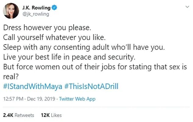 ▲ 明年年初“哈利·波特”上映20周年的特辑节目中,三位主演将集体亮相回归,但近年来就跨性别者论题的争辩中备受指责的罗琳,身为原著作者,却未被邀请到回归特辑节目中。一切都要从2019年英国对跨性别人群的政策修改说起。草案规定,跨性别人士可以依靠自我认同而不是物理改变来区分,粗暴来说,哪怕你没有做变性手术,一个生理上的男性,只要性别认同为自己是女性,就可以进入女性空间如女卫生间、女更衣室等等。一位45岁的税务专家Maya Forstater发推质疑这项草案,然后受到网友攻击被解雇。![]()