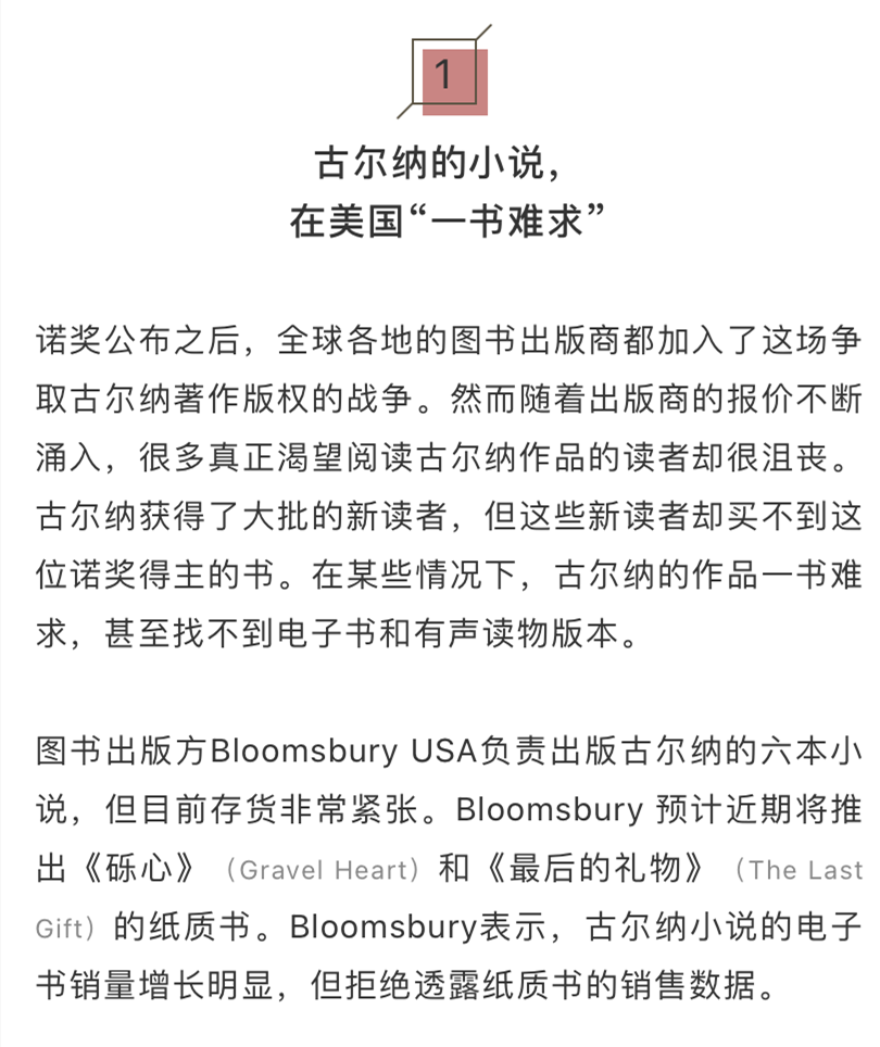 ▲ 古尔纳是今年诺奖的大冷门,中国市场上甚至没有引进过他的任何一部完整作品。只在一部非洲作家短篇小说选集中收录了他的一篇文章。▲ 就连在美国,古尔纳的作品都一本难求(因为当年印得太少),可见他的大众知名度有多低。更足见敢于出版他作品的出版商的勇气……说回罗琳,好不容易在英国顺利出版《哈利·波特与魔法石》后,没想到,这本小说的版权被高价卖到了美国。作品被认可,稿酬也是最原始的动力,罗琳终于有机会把脑海中的故事一一写下来。罗琳成名后,当年她写作《哈利·波特》的咖啡馆,也成了书迷和影迷的“朝圣地”。![]()
