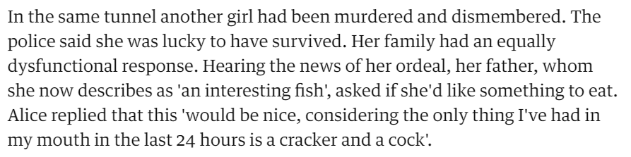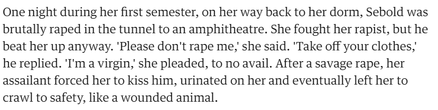 1981年,还是雪城大学大一新生的艾丽斯在学校附近的公园里被性侵,她报警后,警察却没能找到嫌疑人。▲ 她获救之后,警察告知她,前不久就有一个女孩在这条隧道里丧命,艾丽斯算是捡回一条命。5个月后,艾丽斯在学校附近的一条街上发现了那个强奸犯,这回警察将他逮捕,最终被判处8到25年监禁。从雪城大学毕业后,她又到休斯顿大学读研究生。研究生毕业后,她开始尝试写作,为了养活自己,做了好几份女服务员的工作,后来实在是在纽约混不下去,她又到了加州,在一个艺术家聚集村里做看门人。39岁时,她写了一本名叫《可爱的骨头》的小说,讲述了一个14岁女孩被强奸和谋杀的故事。![]()