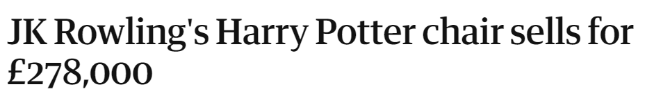 ▲ 到了2016年,只过了7年时间,当时买走椅子的买家再度拍卖,这回以27万8千英镑的高价再度售出……等到“哈利·波特”系列小说完结,罗琳的身价已经达到惊人的10亿美元。凭借同名电影的巨大影响力,反过来继续带动图书在全球范围内的热销,源源不断的版税进入罗琳的口袋,真正做到了“躺着赚钱”。![]()