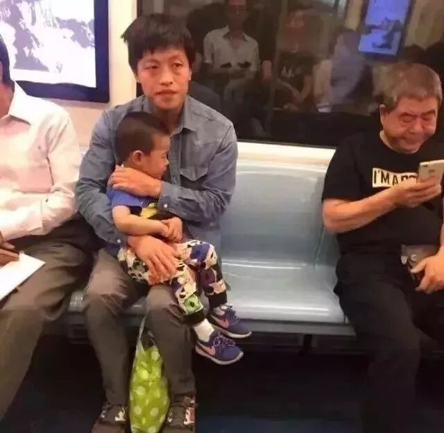 西安地铁上,即便旁边还有一个空座,但父亲还是坚持抱着孩子。
