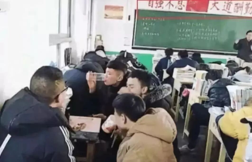 四个学生在课堂上谈笑风生,还不忘大口吃肉、小酌几杯美酒,根本无视讲台上的教书先生……