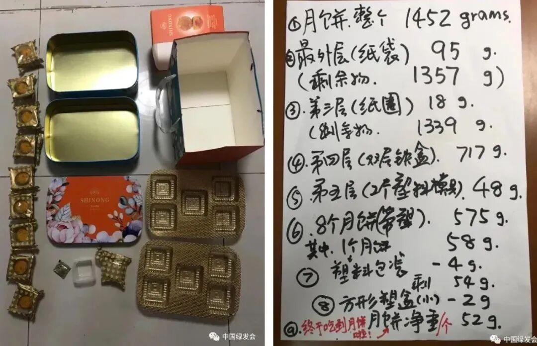 此前,“中国绿发会”专门比对拆解过一份月饼。整个重量为1452克,其中月饼净重为500克,包装里外一共8层,是月饼净重近两倍。