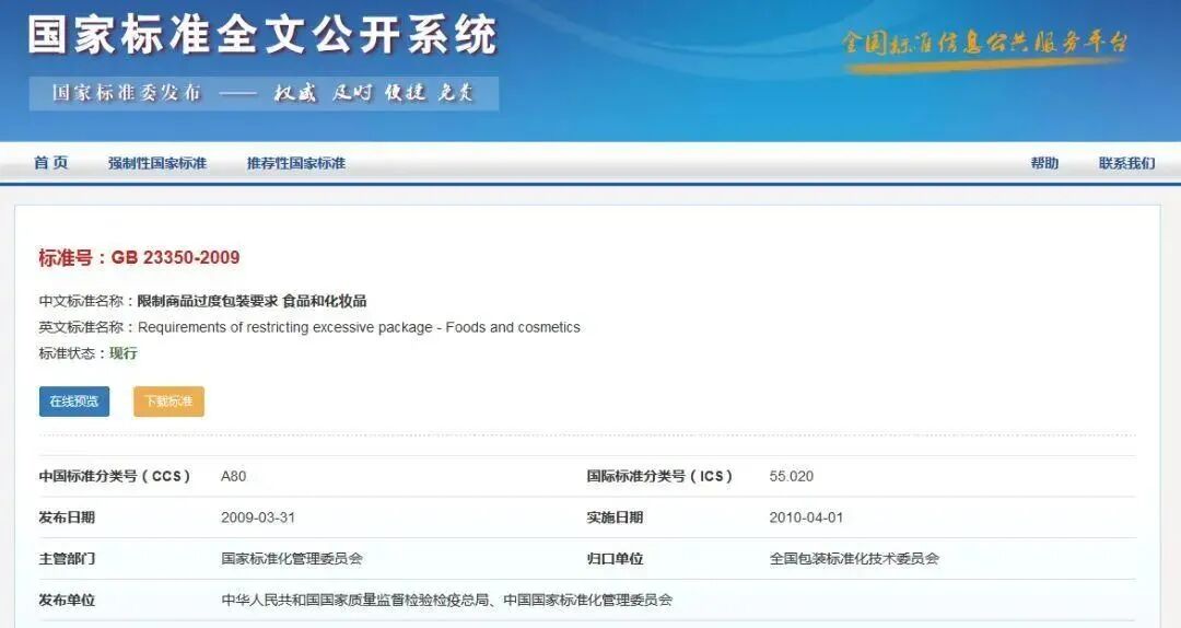 从2010年4月1日起,开始执行《限制商品过度包装要求——食品和化妆品》国家标准。
