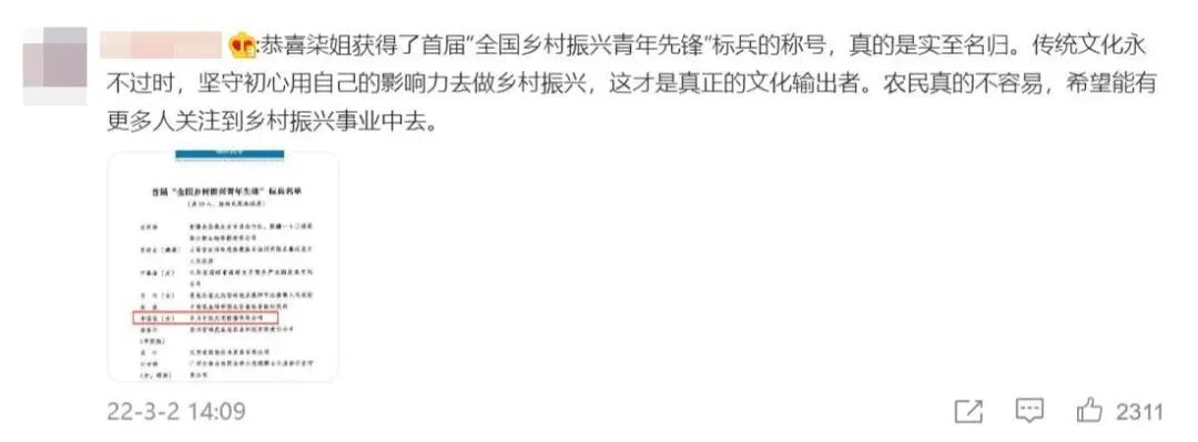 在李子柒最新的那条微博下面,有人在留言中指出,她已获得了首届“全国乡村振兴青年先锋”标兵的称号。