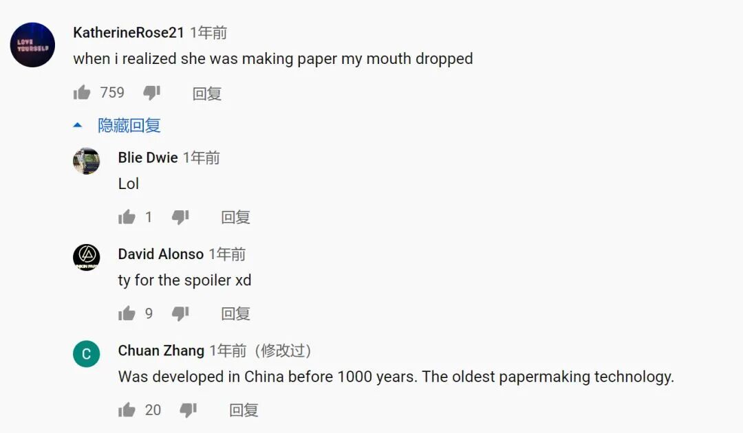 而在“古法长安纸”的那期视频下,有外国人惊叹:原来中国在1000年前,就发明了造纸术。