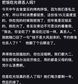 另一方面,她看着舍友们全都是吃一半剩一半的样子,也产生了疑惑,难道吃光饭真的丢人吗?