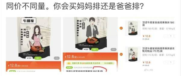 比如某品牌曾推出“爸爸排”和“妈妈排”两种同款品质牛排。
