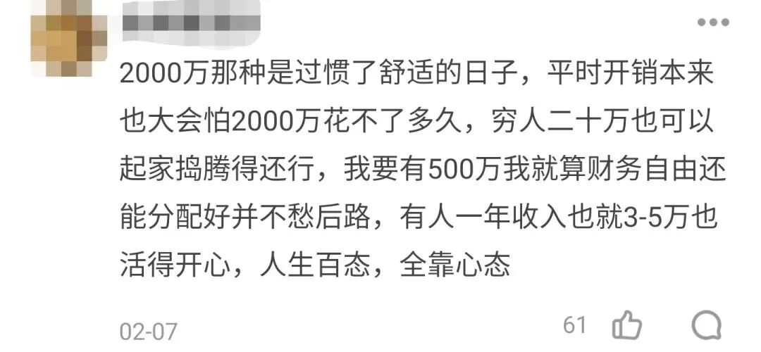 “2000万那种是过惯了舒适的日子,平时开销本来也大,会怕2000万花不了多久。人生百态,全靠心态。”