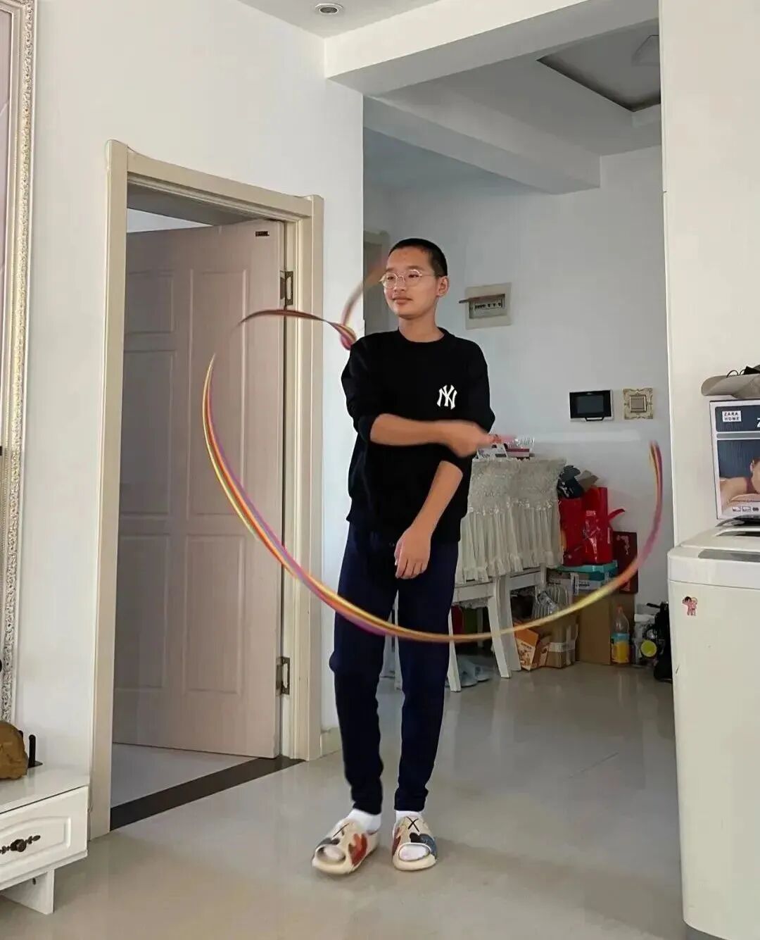 他会偷穿姥姥的高跟鞋,在地板上走台步,然后把丝巾、床单披在身上,扮演影视剧中的大侠。