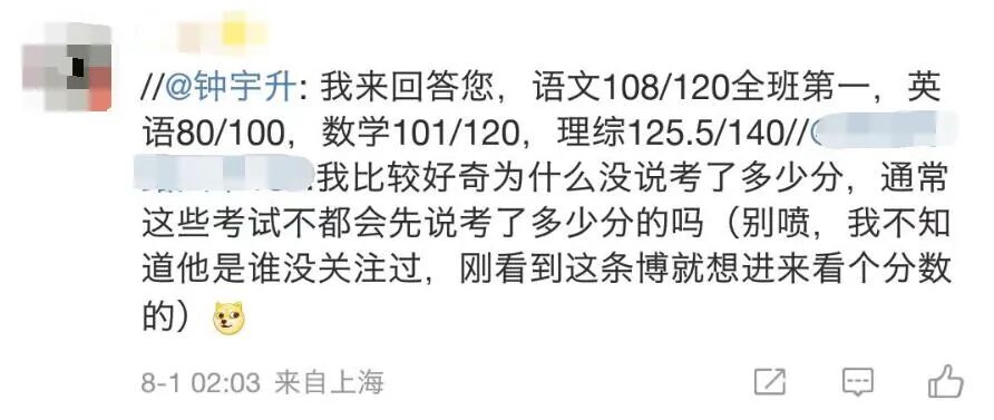 钟宇升并不希望这些事情被媒体报道,但是奈何已经有人扒出了他的中考成绩。
