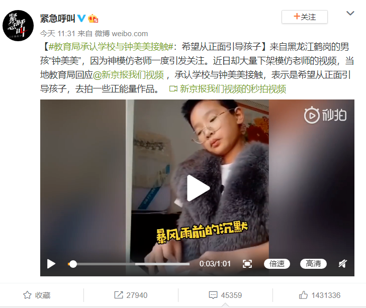 学校也和钟美美接触,鼓励他拍正能量的视频。