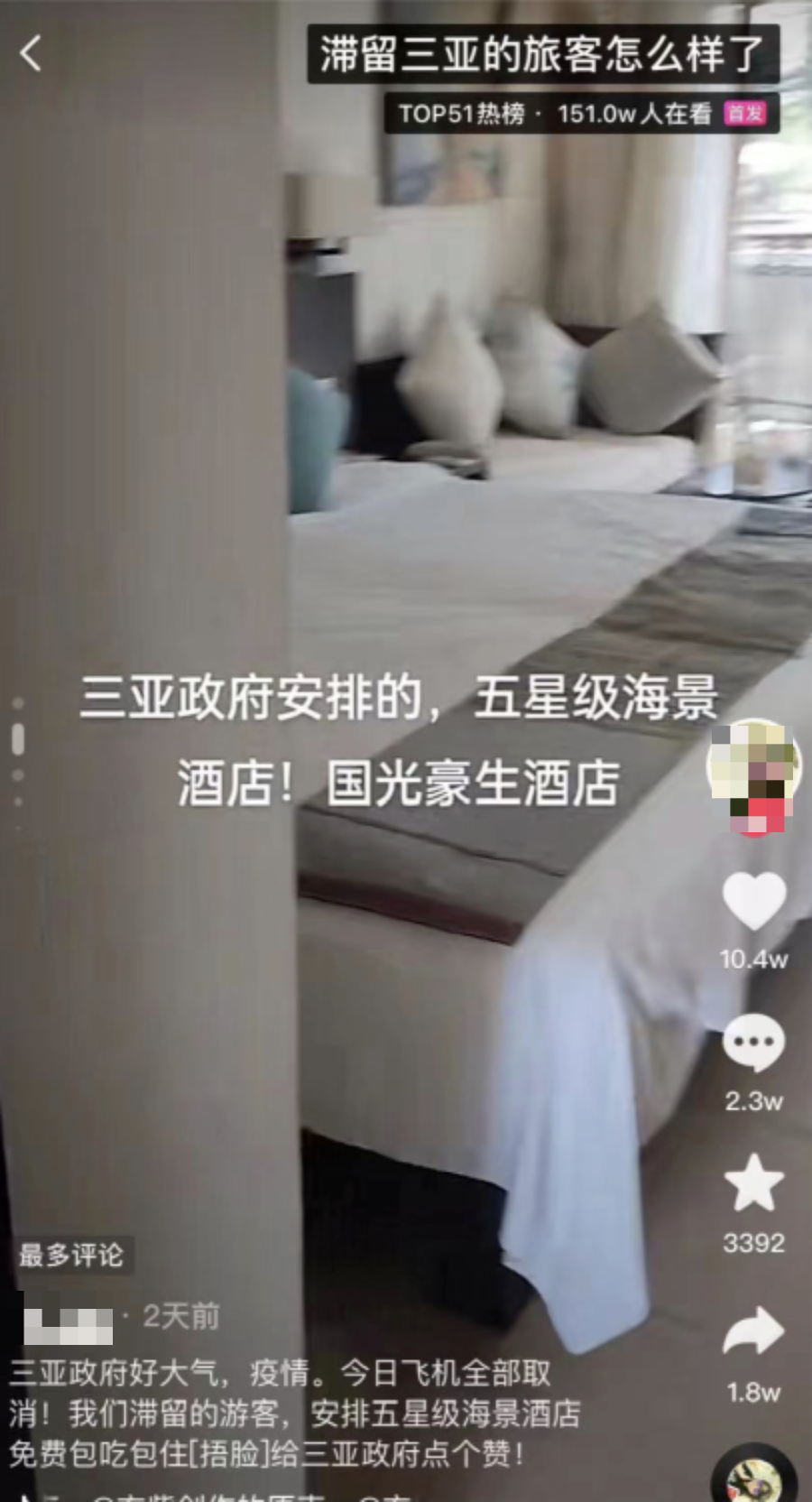 有人大骂酒店趁机坐地起价,大发国难财;有人抱怨防疫太严,买不到离岛航班;有人晒出天价住宿、天价餐饮,痛斥当地人割游客韭菜,甚至上升到了地域黑。