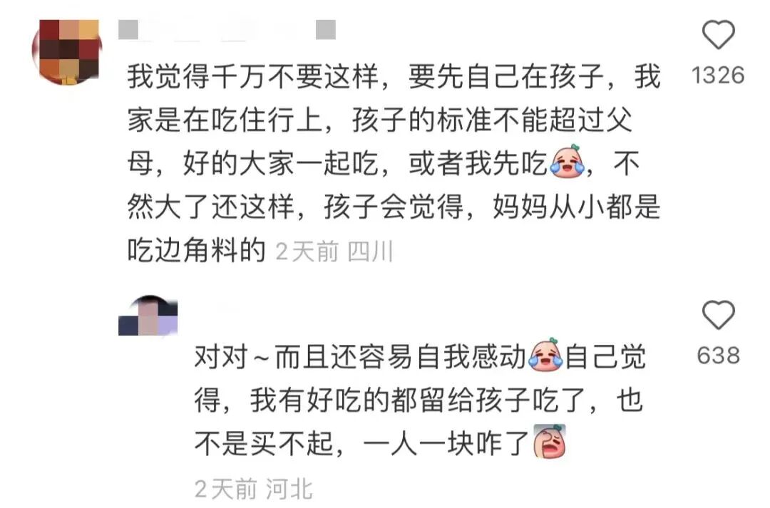 “我觉得千万不要这样,要先自己再孩子,不然孩子会觉得妈妈都是吃边角料的。”