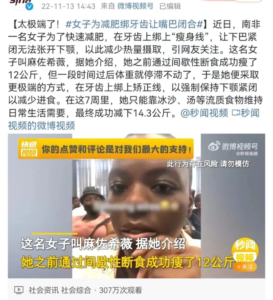 南非有个狠人,为了快速减肥,在牙齿上绑上“瘦身线”,让下巴紧闭无法张开下颚,以此减少热量摄入,达到瘦身目的。