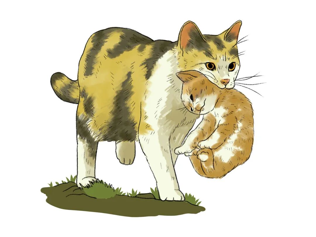 在进化过程中,那些被妈妈咬住后脖颈时还疯狂乱动的小猫很容易被摔死,自然选择只让那些拥有“妈妈咬住后脖颈就要变乖”这个基因记忆的小猫存活了下来。我们可以想象这样的场景:在野外,带着小猫崽的猫妈妈突然遭遇捕食者的袭击,准备一口叼起自己的娃撒腿就跑,这时那些乱动乱叫的小猫就很难存活下来。