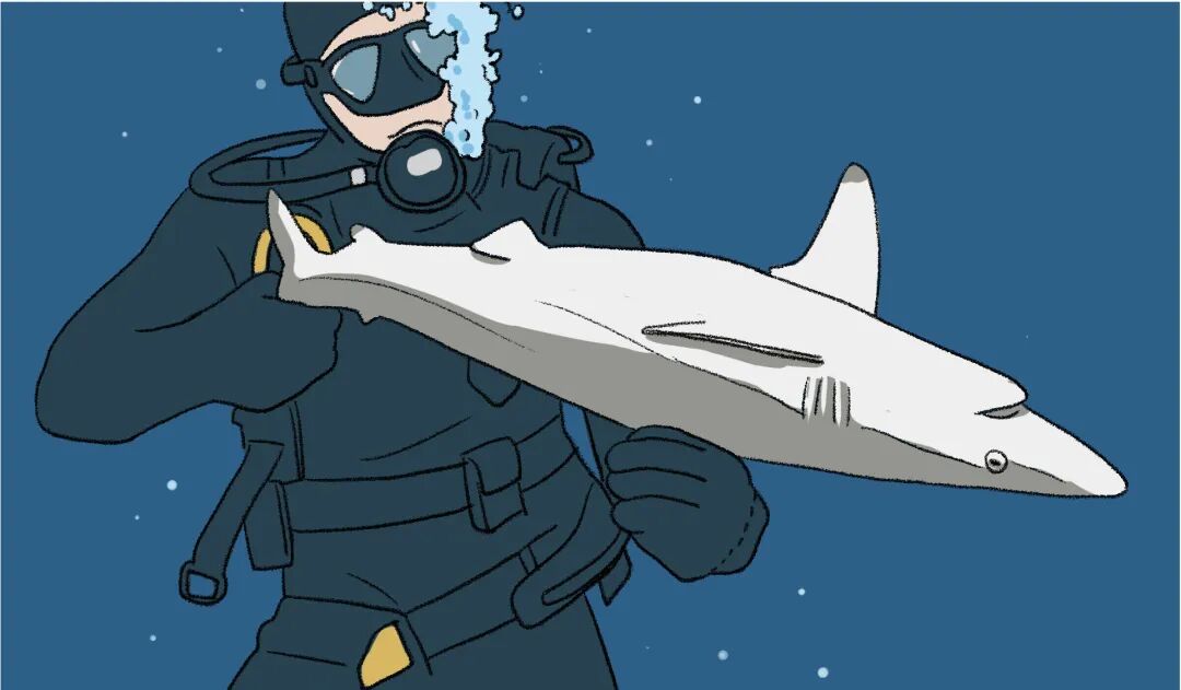 如果鲨鱼的个儿头比较小,哈维还有另一个手段让鲨鱼乖乖进入装死状态。手法听起来很简单:像端起一杆枪一样,左右手分别抓住鲨鱼的背鳍和尾鳍,给鲨鱼翻个个儿。一旦肚皮朝上,鲨鱼就会变得非常温驯。
