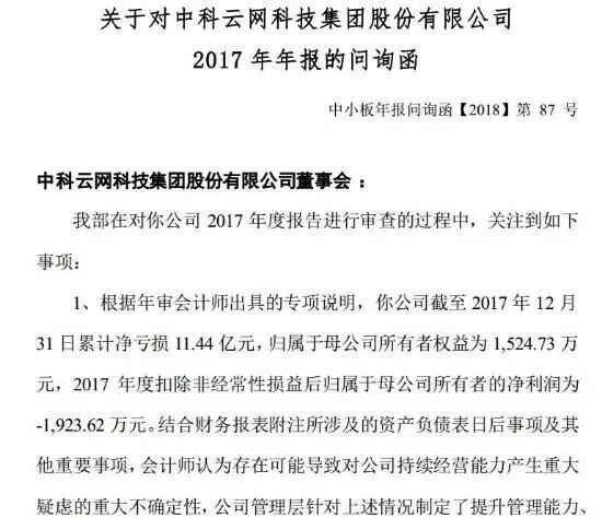 根据2017年年报显示,中科云网年度巨亏11.44亿,公司因连续两年亏损面临退市风险警示。目前已有不少投资者对其未来表示担心,161名股东以公司虚假陈述责任纠纷为案由要求上市公司赔偿损失。