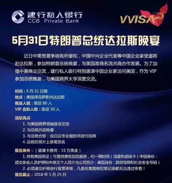 广告上还写道,为了加强中美商业交流,建行私人银行特别邀请中国企业家访问美国,作为VIP参加总统晚宴,与美国商界大亨深度交流。