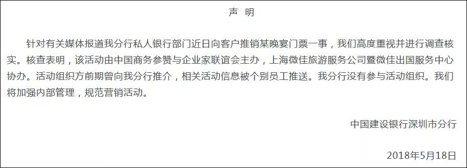 对于上述消息,建设银行深圳分行已作出回应称,针对有关媒体报道我分行私人银行部门近日向客户推销某晚宴门票一事,我们高度重视并进行调查核实。