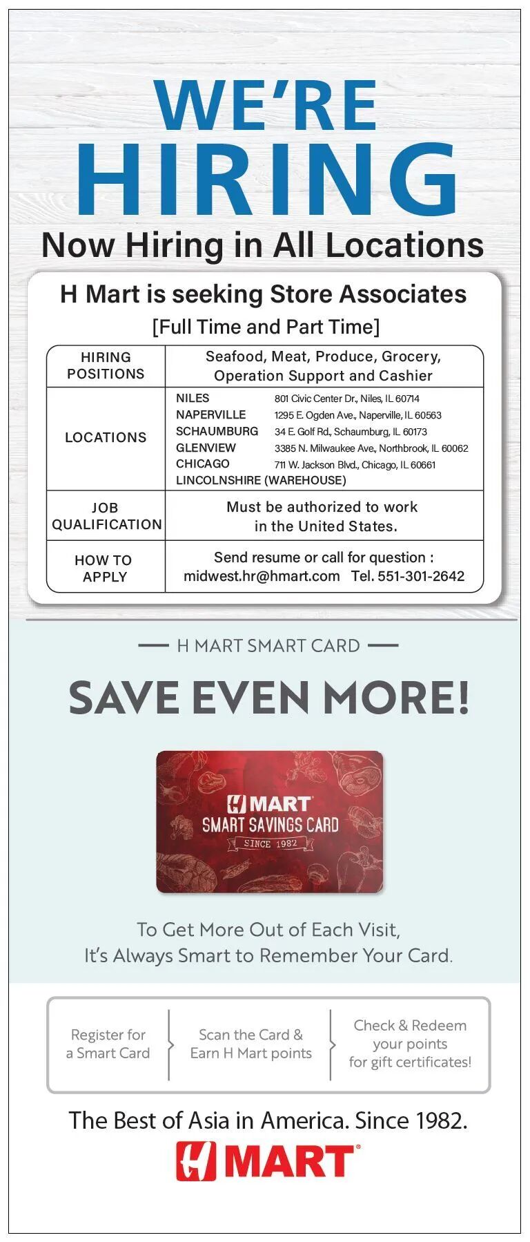 H Mart 伊利诺伊各分店现正招聘中 店铺各部门招聘 (全职/兼职) 收银/ 运营支持/ 水产部/ 蔬果部 肉品部/ 杂货部 有意者可将个人简历(英文) 发送至midwest.hr@hmart.com 或致电(英文)551-301-2642 *须持可合法在美工作身份