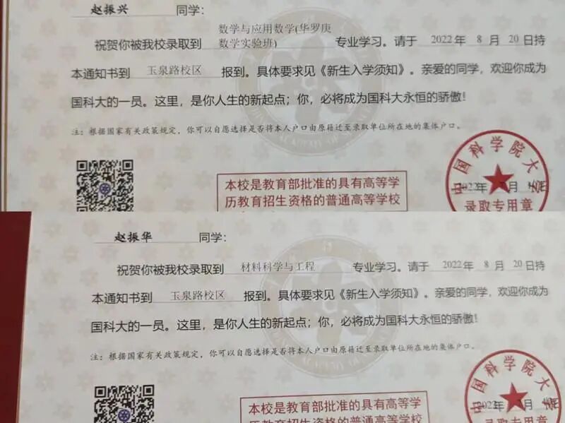 赵振兴和赵振华已收到录取通知书