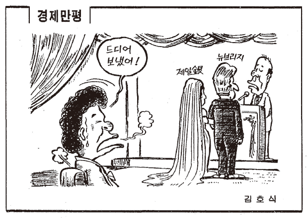 當時的漫畫將第一銀行描繪成嫁不出去的醜女,右邊正在走開的男子是新橋,心想「她和照片一點都不像……」。左邊女子的對話是:「為了盡快把她嫁出去,他們給她做了整容手術……」「聽說還要再花3萬億韓幣才能整完。」