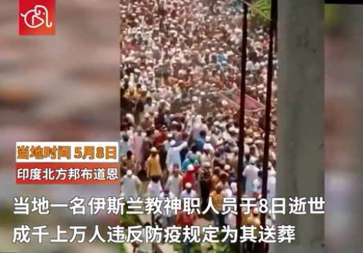 据央视新闻报道, 5月9日印度媒体报道了一场穆斯林葬礼引发关注。当地一名伊斯兰教神职人员于5月8日逝世,成千上万人违反防疫规定为其送葬。视频显示,送葬人群密密麻麻挤满街道,多数人未佩戴口罩,一大群人簇拥在死者棺木周围,为伸手抚摸棺木互相推搡。
