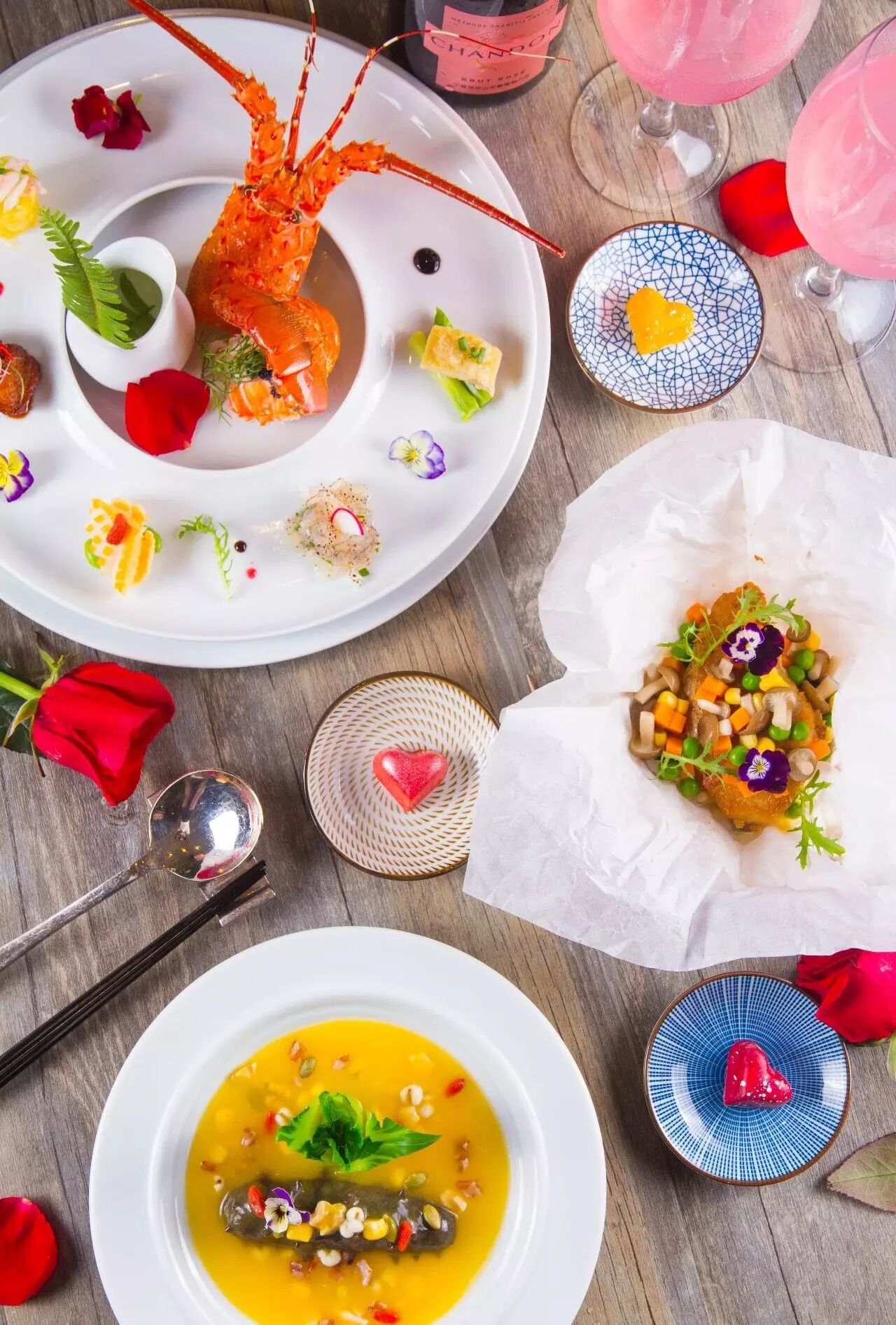 宴庭的中餐厅更是会为你呈现大厨刘师傅创意搭配的六道式七夕情人节套餐:含宴庭精致冷餐碟为前菜,枸杞瑶柱炖响螺渲染丰富的口感,红酒汁煎牛小排及金丝沙律明虾球提升感官享受。最后的甜品将热情果的酸甜与巧克力结合,迸发激情与甜蜜,不经意间表达深深的爱意。