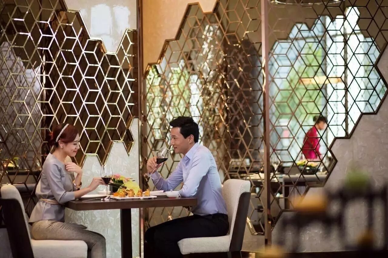 彩丰楼中餐厅源自中式鸟笼的餐厅设计,金属线条和暖色灯光遥相呼应,禅意韵味中,度过传统七夕佳节。