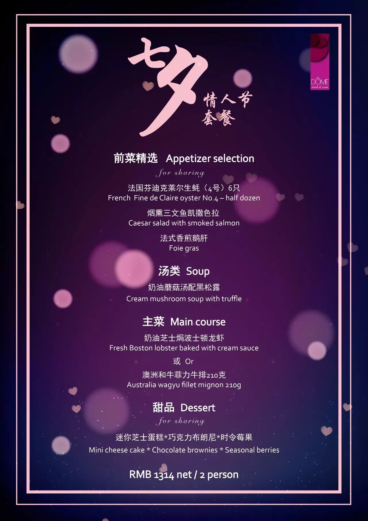 DÔME牛扒馆8月28日特别推出一生一世七夕情人节套餐,这个七夕,在JW万豪,见证海誓山盟。