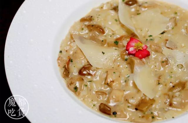 这份牛肝菌烩饭用料讲究,厨师选用云南牛肝菌为主料,搭配上帕尔玛成芝士片。刚端上桌的时候就有阵阵香味飘来~用勺子挖上一勺,米饭包裹着牛肝菌和芝士片,送入口中......牛肝菌的鲜味配上芝士、黄油的奶香味,满口生香,每一口都感觉到幸福满满~