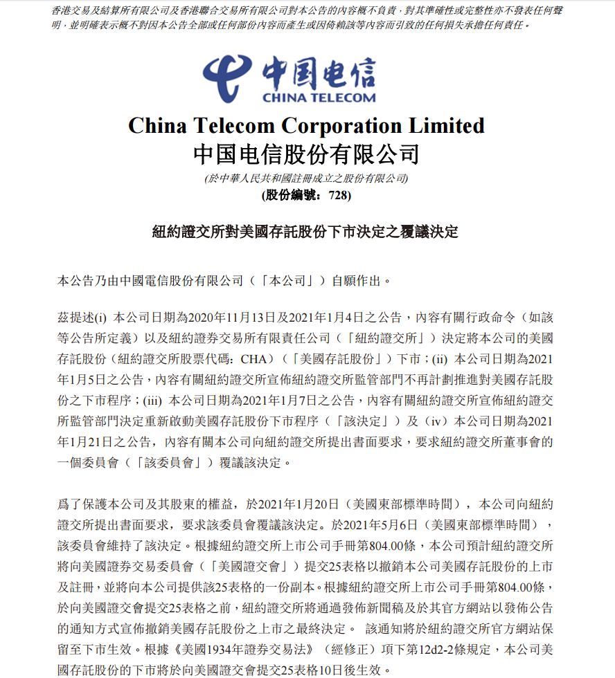 2021年1月1日,纽交所宣布将依据美国总统行政令要求中国移动、中国联通和中国电信三家公司从纽交所退市。