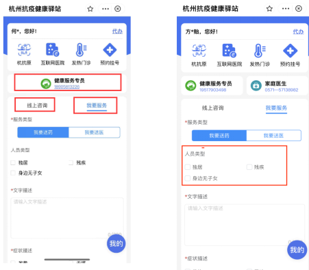 80岁以上老年人,患有基础疾病、未全程接种疫苗,失能的或者接受透析、肿瘤放化疗的65岁以上老年人,以及高危孕产妇等群体感染新冠后发生重症的风险较高,是需要重点关注的群体。杭州抗疫健康驿站已与相关的健康管理信息系统数据互通,相关重点人群登录小程序后,将显示所在社区的家庭医生电话,可以一键拨打家庭医生电话进行咨询,接受健康指导和健康状况评估。