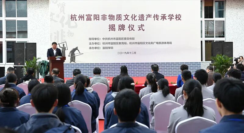 自2010年开始,富阳就开展非遗进校园工作。目前,全区已有非遗传承教学基地43个,其中省级1个、市级2个、区级40个。2019年9月,在区委区政府推动下,区文广旅体局、区教育局联合在富阳学院内建设杭州富阳非物质文化遗产传承学校,设有竹纸制作技艺、传统装帧技艺和根雕等6个项目的传统工艺方向课程,成为政府扶持、产教融合、赛教合一的非遗传承平台,形成有富阳特色的非遗传承创新实践。