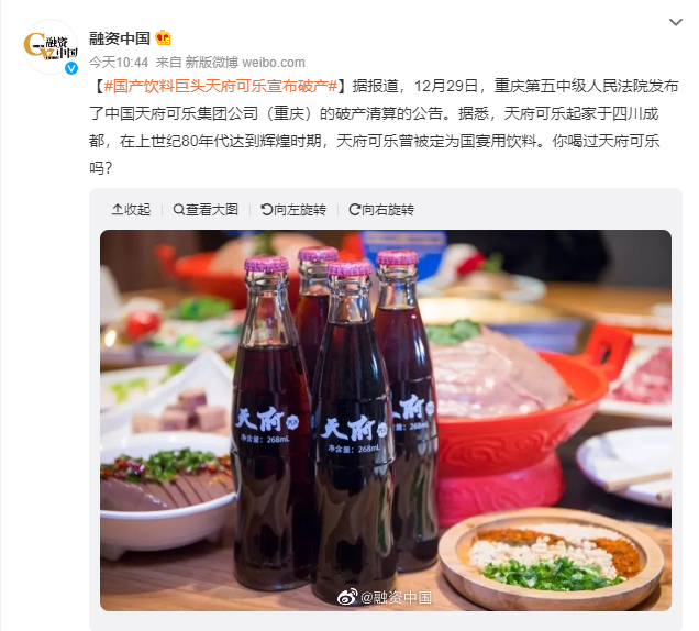 重慶市第五中級人民裁判所は12月29日、中国天府可楽集団(重慶)の破産清算に関する公告を発表した。 “中華コーラ”のシンボルとして君臨した“天府コーラ”の製造メーカーとして知られてきたが、今後の正常なブランド継続に影響はないという。