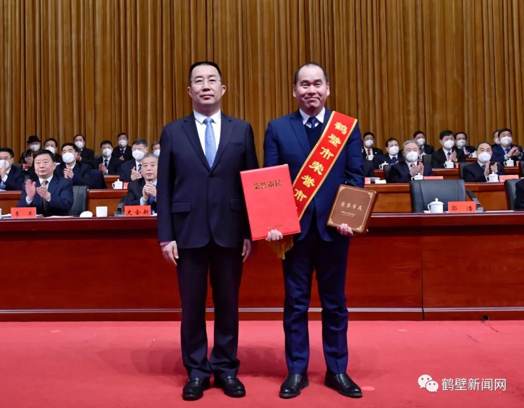 △市长郭浩为“鹤壁市荣誉市民”甄国宾颁发证章和荣誉证书。