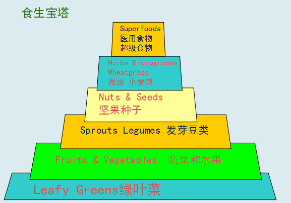 • 食生的英文 the living foods 在生食的基础上加入发酵和发芽食物, 这样更多的豆类和谷物可以进入到生食中,营养更加全面。