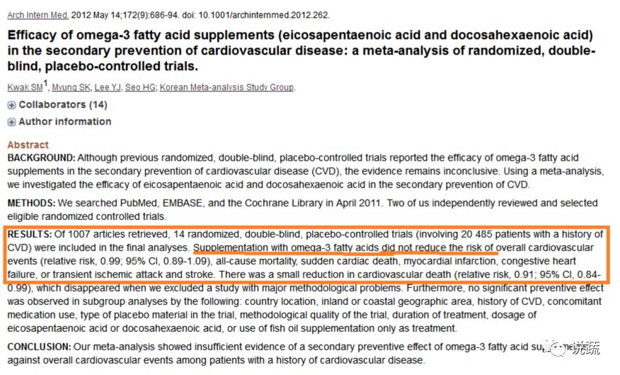 综合上述研究,研究员得出结论:在所有的临床实践中都使用ω-3脂肪酸是没有理论依据的。如果患者听从美国心脏协会的建议,要求医生开鱼肝油补充剂,医生该怎么办呢?西奈山医院心外科的主攻脂肪和代谢的 主任如是说:“鉴于此项和其他得出负面结论的元分析研究,我们(医生)应该停止为 患者开大肆推广的鱼肝油补充剂。”