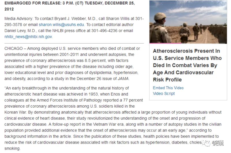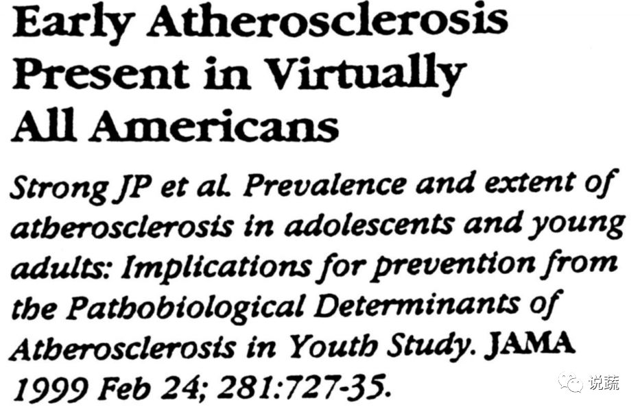 1953年,一篇发表在《美国医学协会》的研究彻底改变了我们对心脏病的认知。研究员对在朝鲜战争中牺牲的22岁左右的300位美国士兵进行了一系 列的尸检,结果令人震惊,77%的士兵有明显的冠状动脉粥样硬化。甚至有人的动脉阻塞面积达到了90%以上。研究显示,人的冠心病被临床确诊的数十年前,其冠状动脉中早已有动脉粥样硬化的出现。