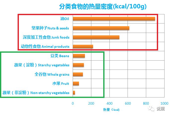 低脂全蔬食要求食材低脂,虽然允许高脂食物,但必须严格限值。在调味品中,最重要的是油,油很容易让脂肪超标。在吃饱瘦身的秘诀 和 吃饱瘦身的秘诀II 中介绍了热量密度CD和热量密度指数(CDI)这两个概念。高脂的食物通常热量密度也很高。油的脂肪含量为100%,其热量密度指数高达900千卡/100g,在下图中,可以清楚地看到。