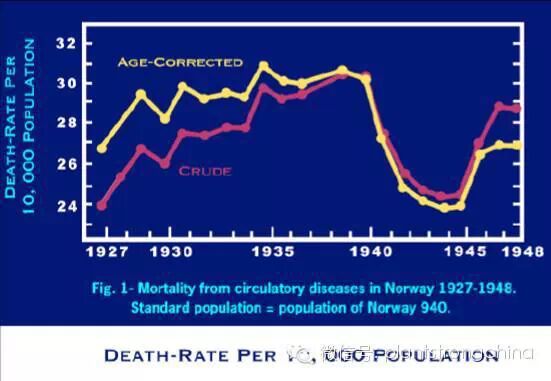 下面的例子也是这样。1939年到1945年的第二次世界大战期间, 德国侵略军队剥夺挪威人的牲畜, 结果使动物性食品的供应量大大减少,其间该国死于心脏疾病和中风的人数急剧下降。1945年战争结束后,在2年内他们肉类和奶类食品的消费得以恢复14,中风和心脏病发作的死亡率又重新升回至1939年以前的水平。