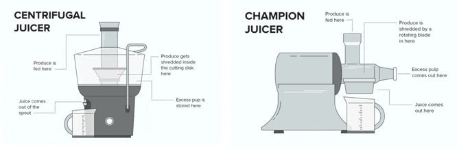 划破是最容易理解的破壁原理,有刀片或者尖锐的划片,就可以实现。划破结合压力,就是冠军牌(champion)榨汁机和离心式榨汁机的基础原理,2者都有小刀片,但在压力上有明显差距,所以出汁率也差异很大。离心式榨汁机是低品质的榨汁机,浪费较大。