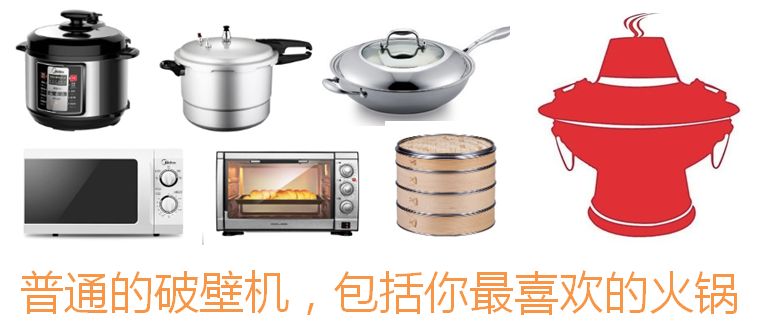用锅煮饭,炖菜,高温会让细胞内的气压升高,最终导致破壁,这是热破。其实,人闻到食物的香味,就表明已经破壁了。各种锅子,高压锅,炖锅,微波炉,蒸箱,处理食物都会造成热破。