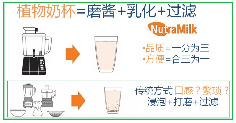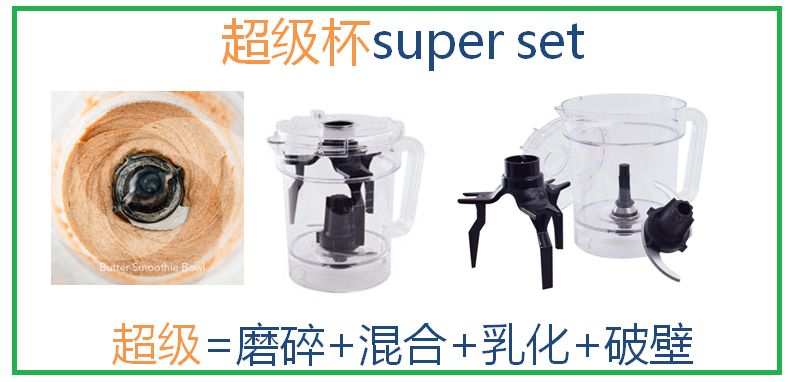 对于低脂肪,含有水份的食材如鹰嘴豆,超级杯主要作用是磨碎和混合,相当于一个混合器(mixer)。如果水份和脂肪都高,就是一个乳化杯。水分偏高,就是植物奶(plant based milk),可以用于奶茶。水分较低的叫植物炼乳(plant based condensed milk ),可以用于咖啡伴侣和奶茶。