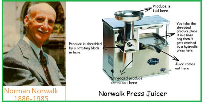 榨汁机(juicer)目标是把蔬果中液体分离出来,通过水份带走营养素。所以,榨汁机是典型的破壁机。Norwalk 榨汁机是压破型榨汁机中标兵。其流程分为2部,第一部,把食物弄碎;第二部,用液压方式,把汁压出。Norwalk榨汁的压力很高,所以出汁率极高。葛森疗法中把它列为首款榨汁机,推荐给癌症病人。主要缺点是价格太高,一台机器要3万块人民币。