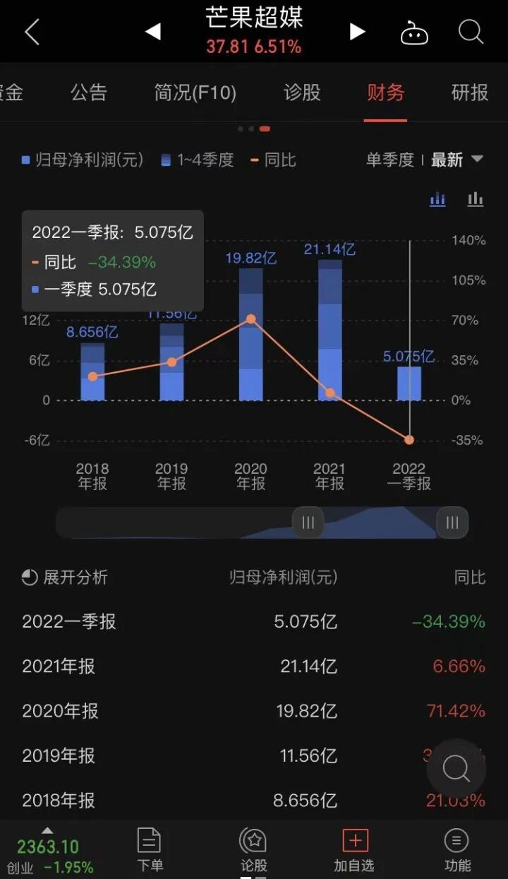 2021年8月,中央网信办发布《关于进一步加强“饭圈”乱象治理的通知》,围绕明星榜单、热门话题、粉丝社群、互动评论等重点环节,深入整治“饭圈”乱象问题。受疫情影响、“清朗行动”和平台预算的收紧等等因素持续制约。财报显示,今年一季度,芒果超媒实现营收31.24亿元,同比降低22.08%;归母净利润5.07亿,同比降低34.39%。今年以来,芒果超媒的股价也在去年下跌20%的基础上,继续重挫超过30%。